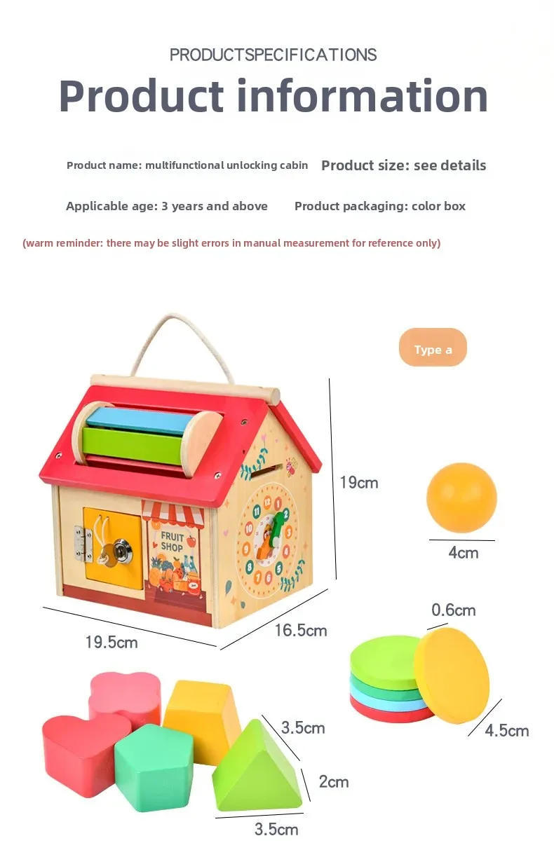 The small โhouseโ design lets children pretend to live or work inside, practicing everyday skills like opening doors, turning keys, and organizing space.